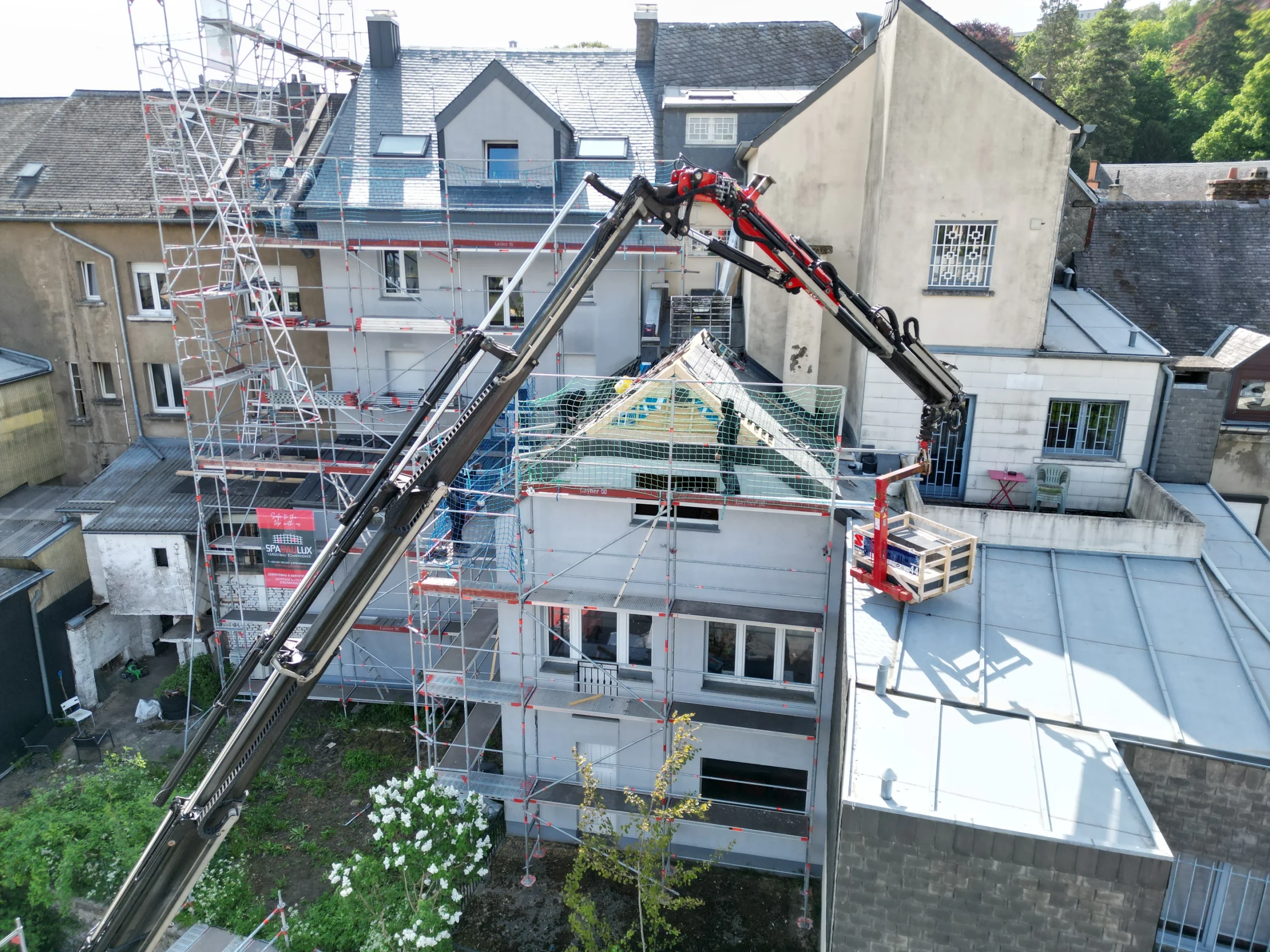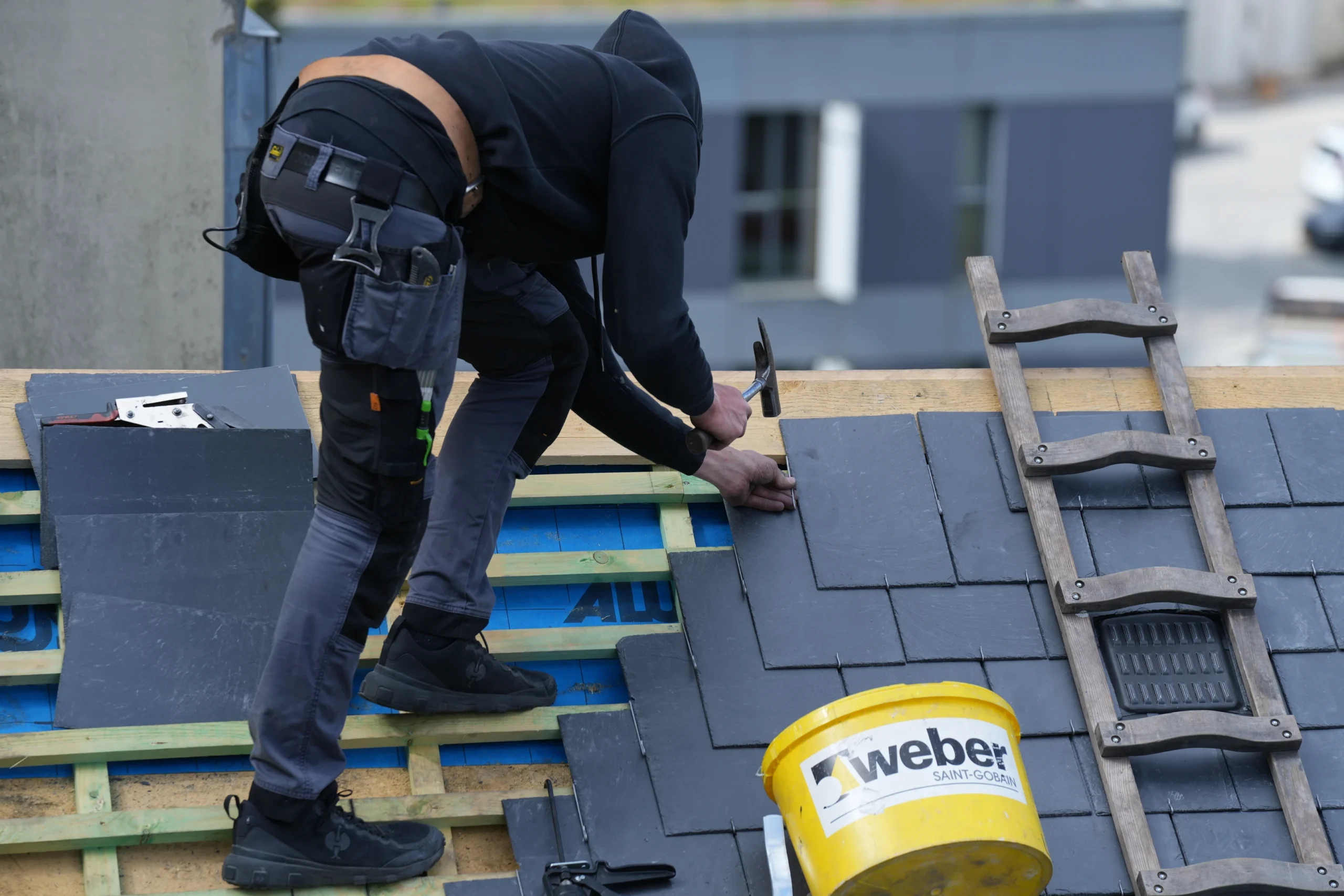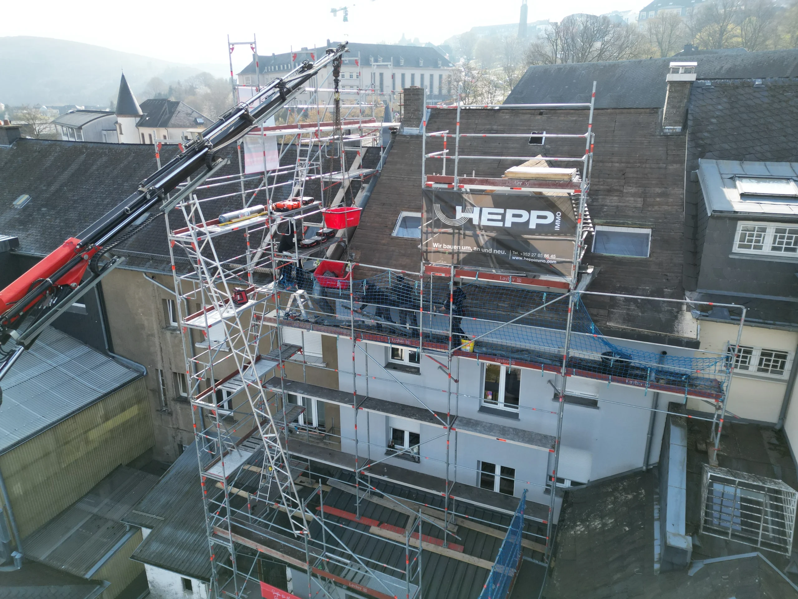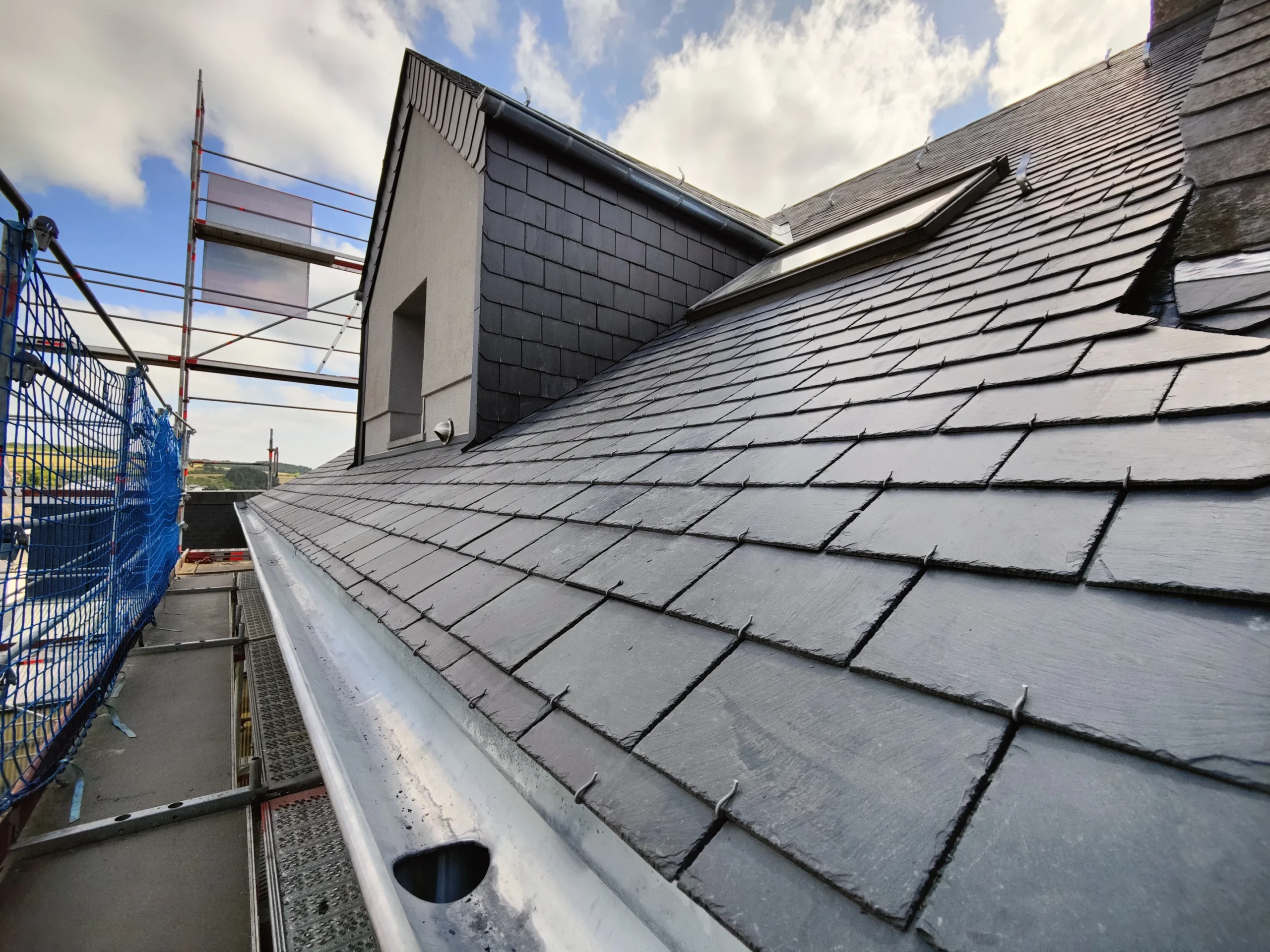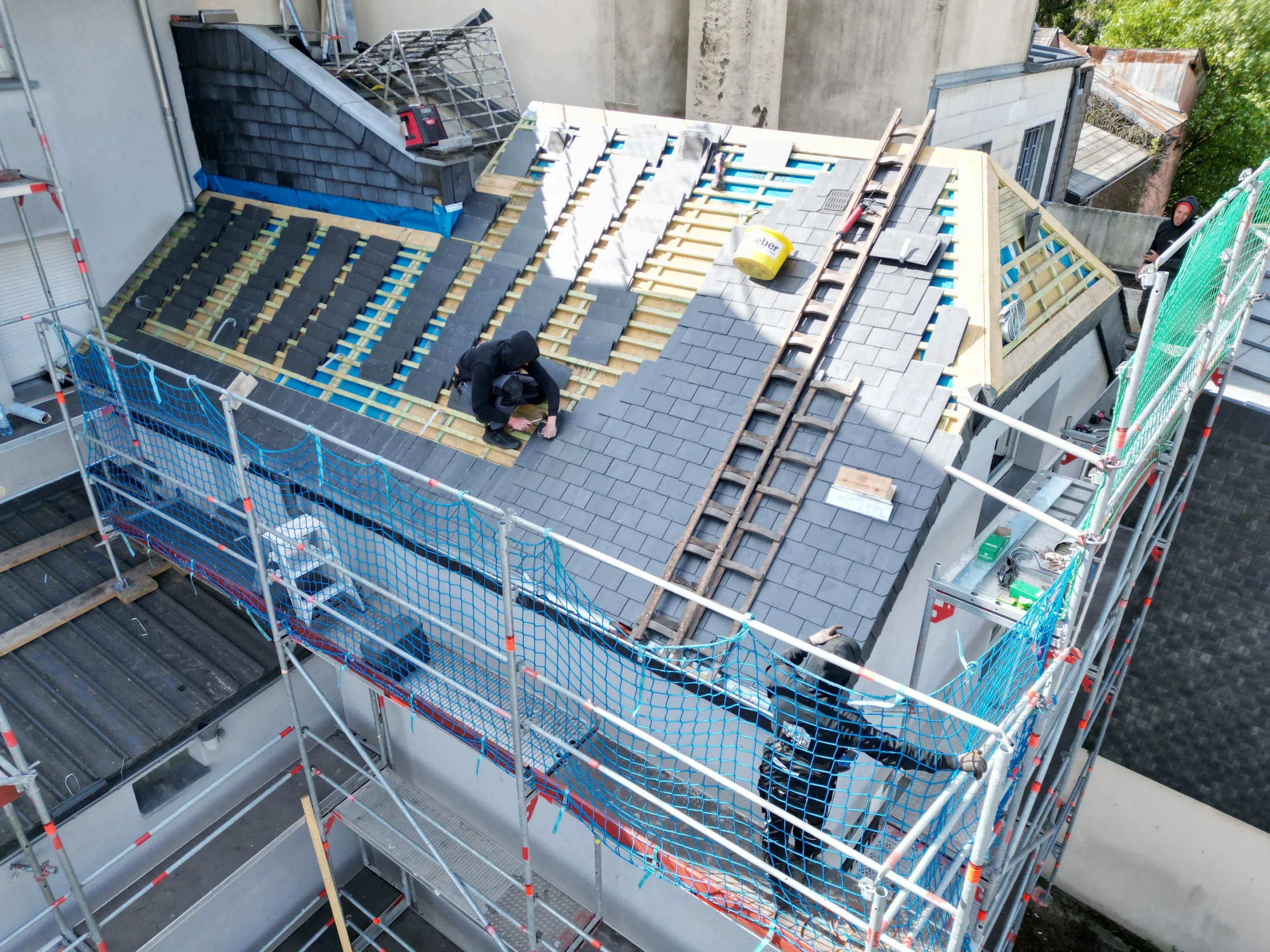 In diesem Projekt haben wir ein komplettes Steildach neu aufgebaut. Die bestehende Dachfläche wurde bis auf den Rohzustand zurückgebaut, anschließend fachgerecht gedämmt und mit hochwertigem Naturschiefer neu eingedeckt. Eine besondere Herausforderung stellte die Arbeitshöhe von über 30 Metern dar – hier war präzise Logistik und absolute Sicherheit gefragt. Trotz der anspruchsvollen Rahmenbedingungen konnten wir das Projekt zügig und sauber umsetzen.