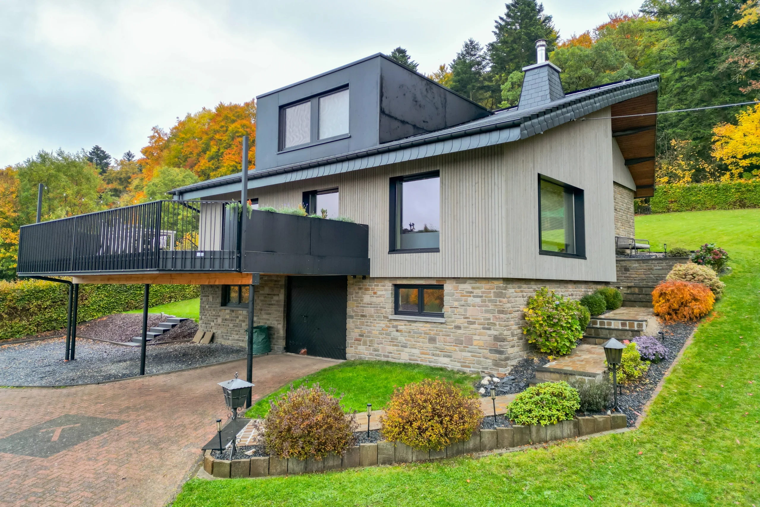 Durch die Kombination aus Holz, Naturstein und dunklen Akzenten fügt sich das Gebäude nun harmonisch in die Umgebung ein und wirkt zugleich modern und hochwertig.