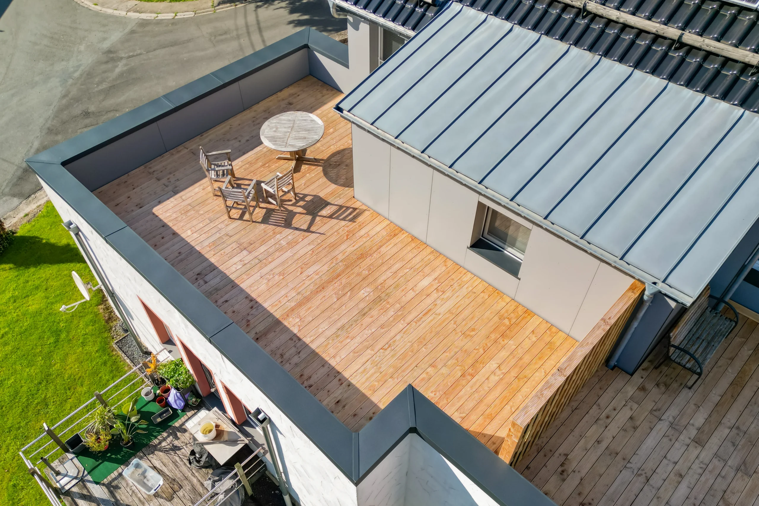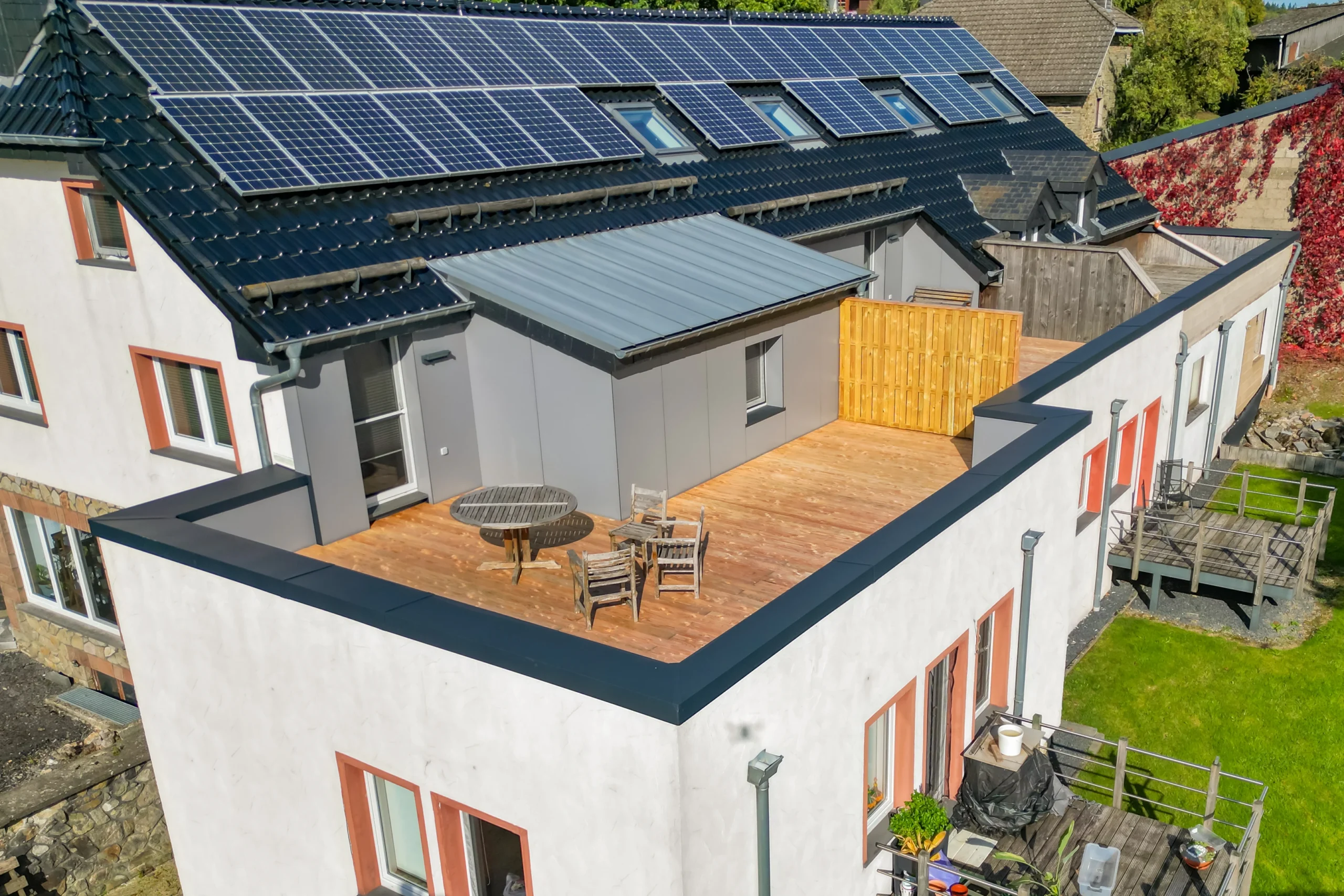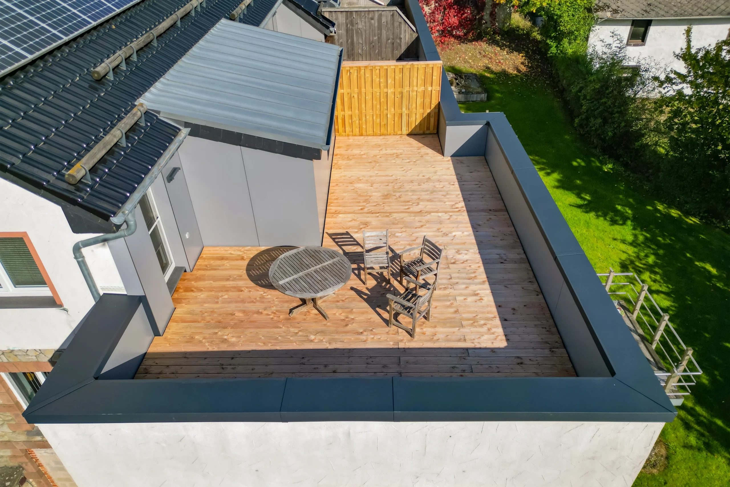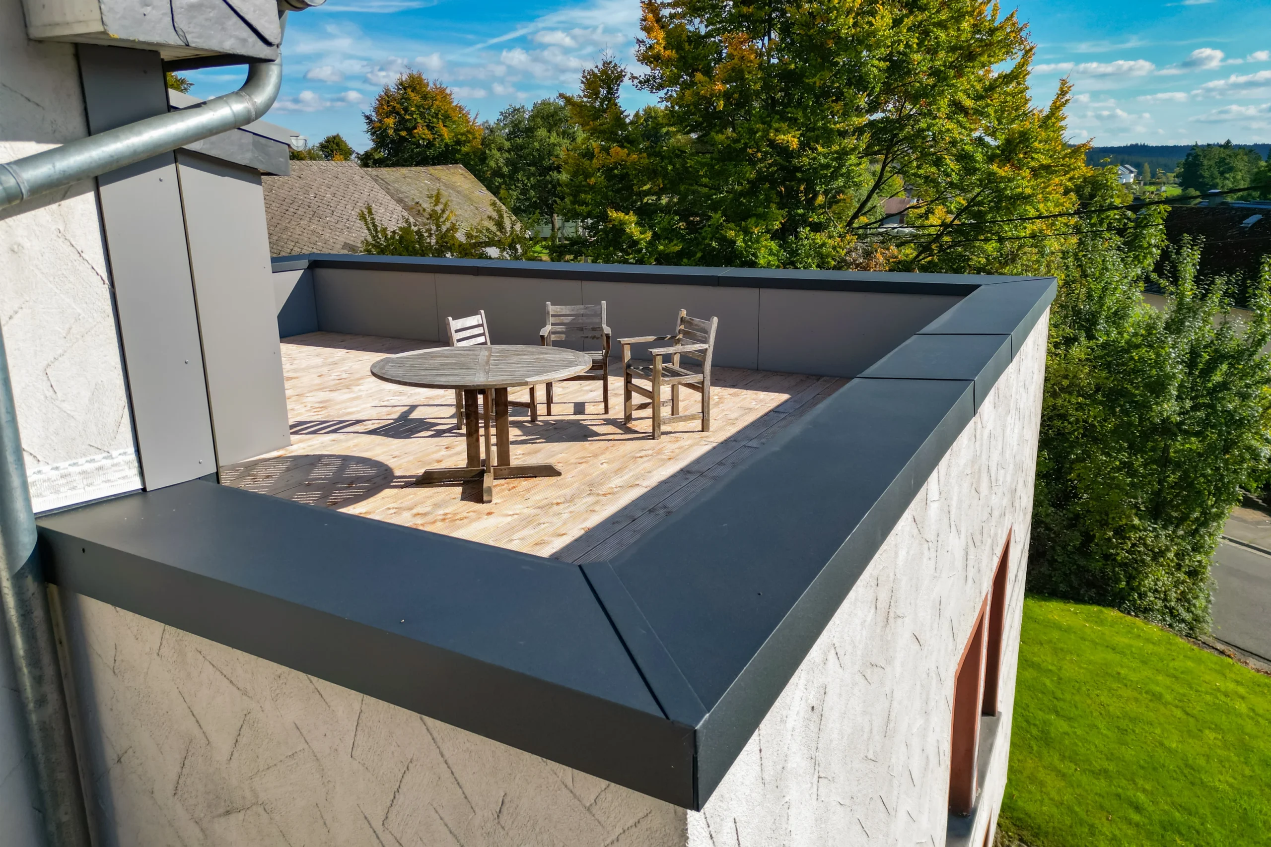Bei diesem Projekt wurden zwei bestehende Dachterrassen umfassend saniert. Es wurde komplett neu abgedichtet und neue Zink-Mauerabdeckungen angebracht. Die Brüstungen erhielten eine moderne Bekleidung aus witterungsbeständigen Trespa-Platten, die für eine klare, langlebige Optik sorgen. So entstand ein technisch wie optisch hochwertiges Ergebnis, das Funktionalität, Dauerhaftigkeit und modernes Design vereint.