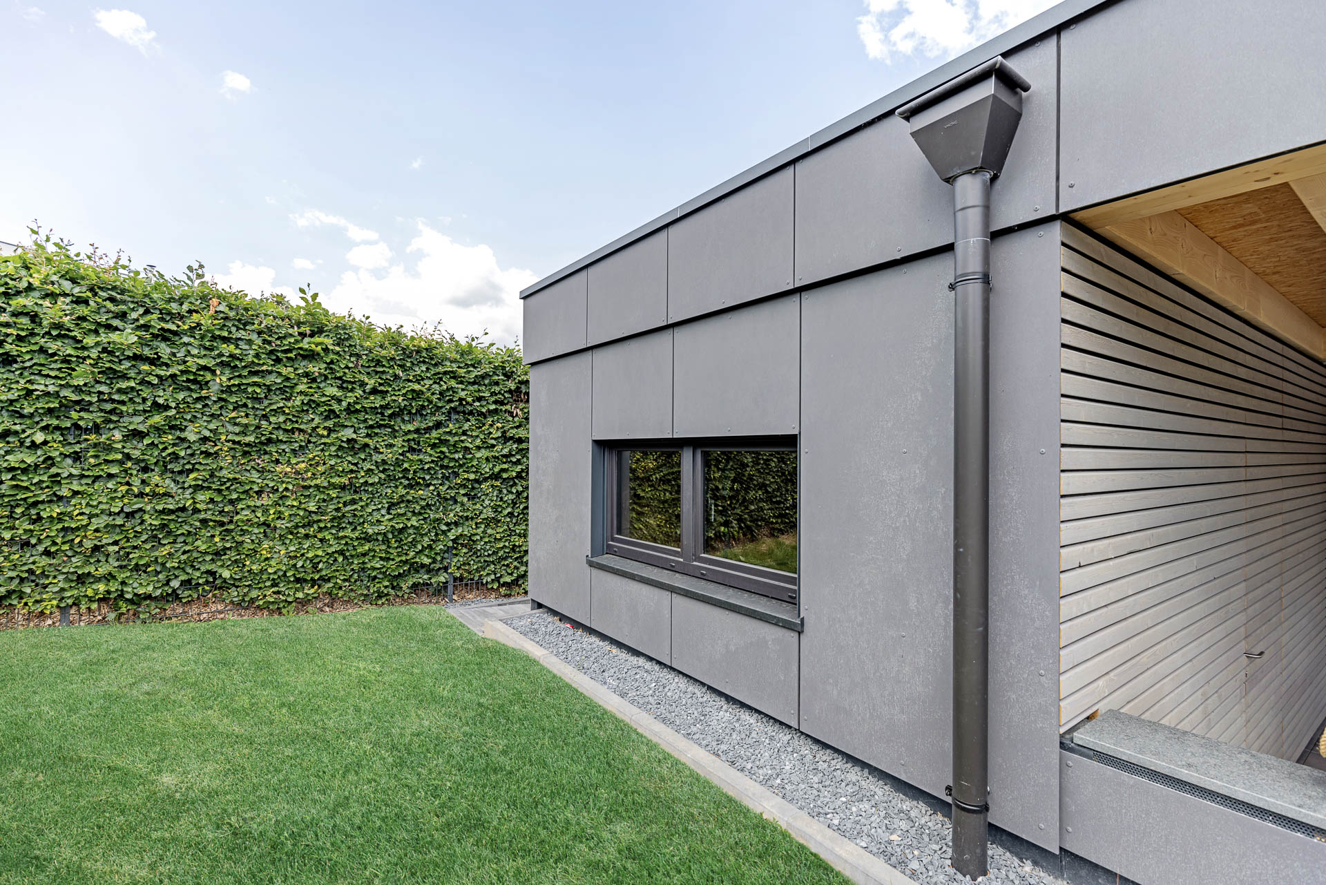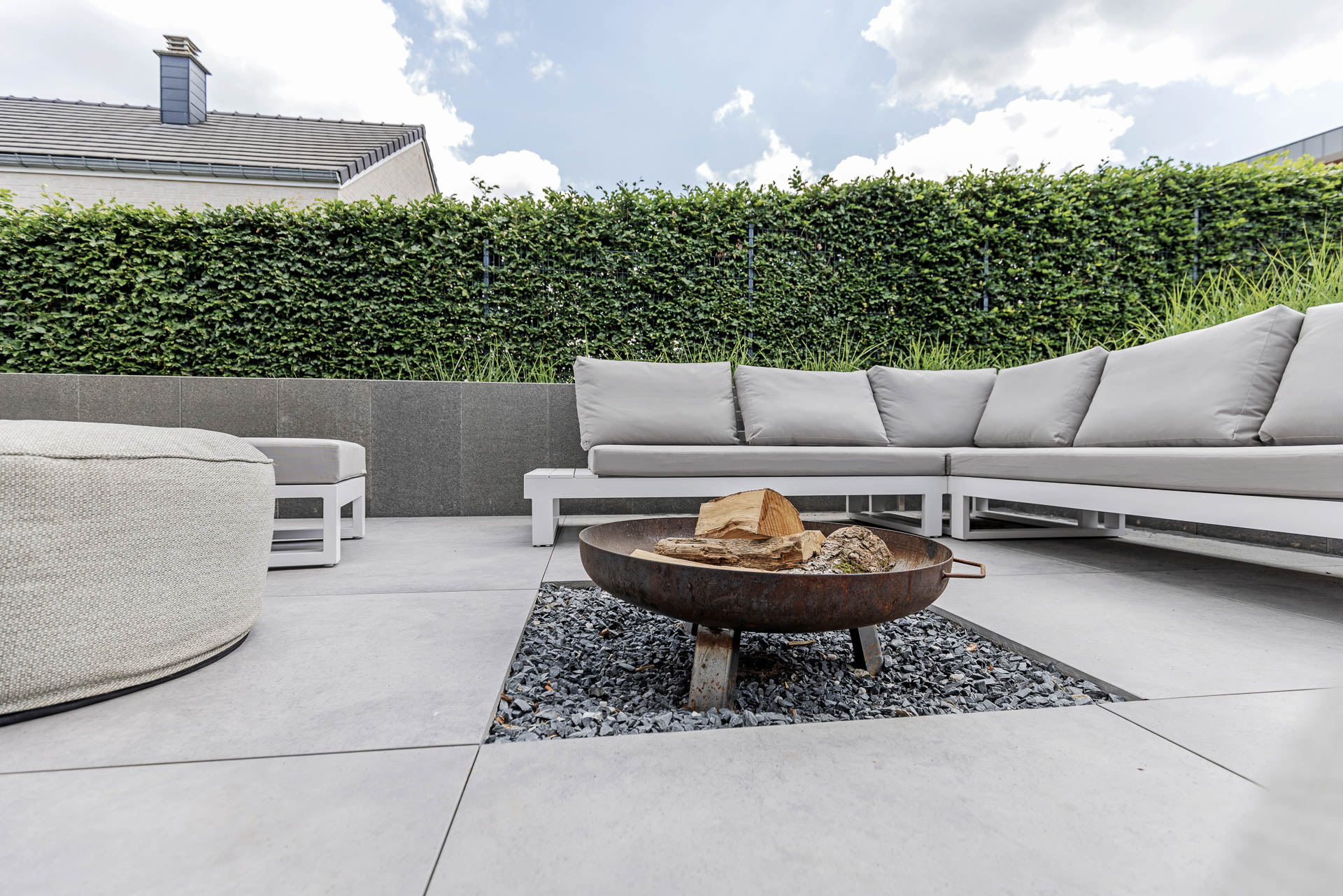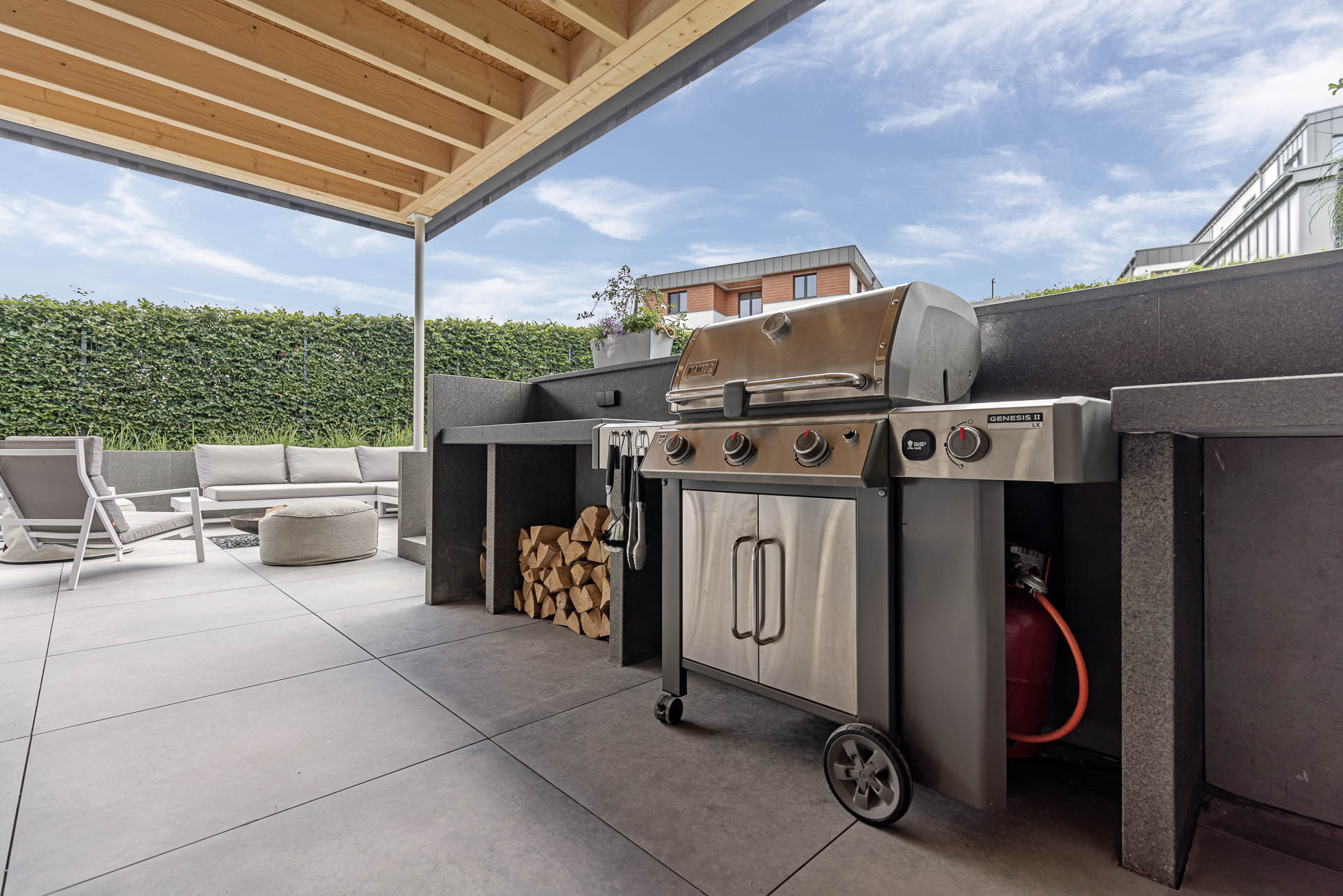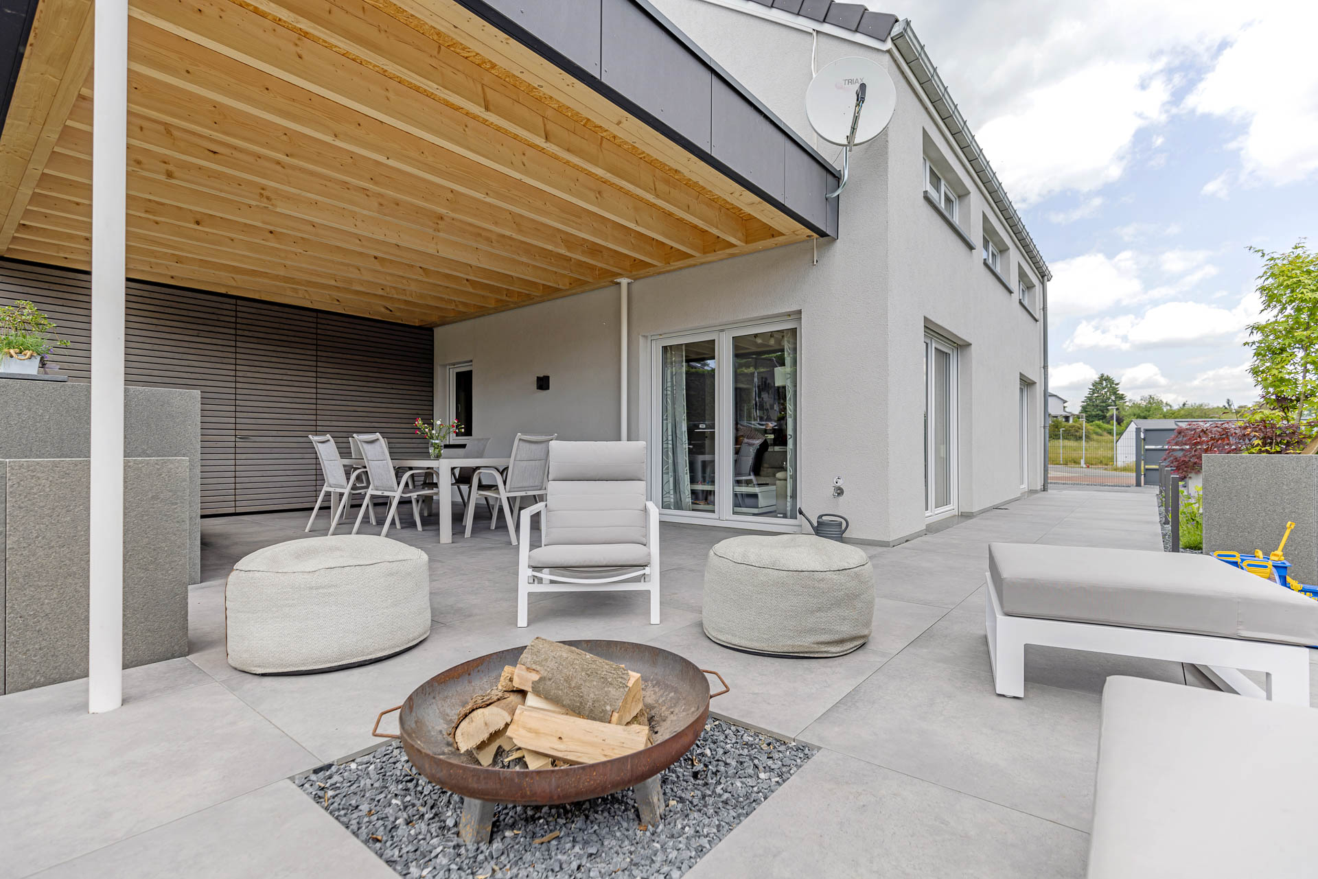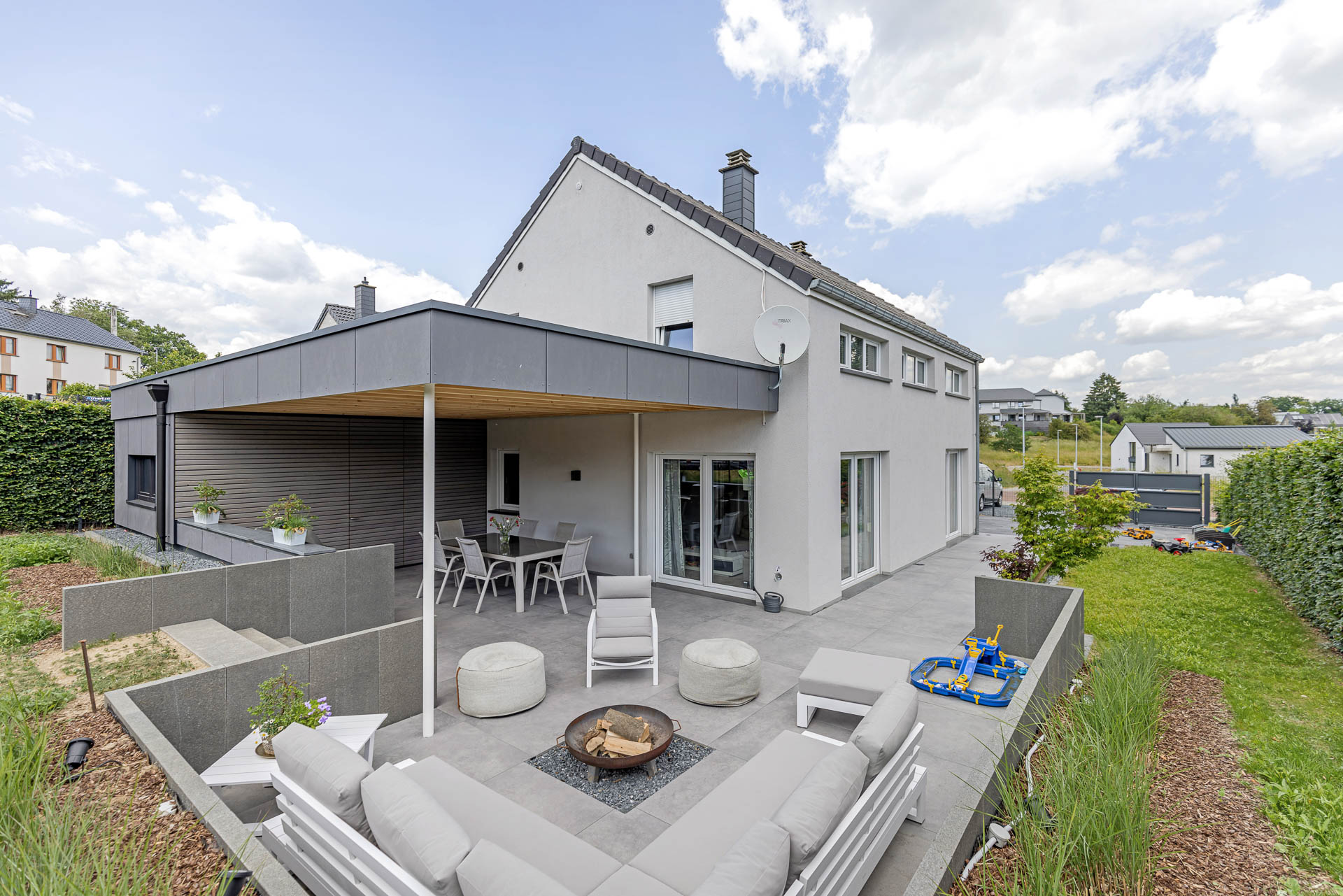 Bei diesem Projekt haben wir die komplette Terrassenüberdachung sowie die Außenanlage realisiert. Dazu zählen sämtliche Erd- und Pflasterarbeiten, die Umsetzung einer modernen, teils überdachten Terrasse mit Feuerstelle und Outdoor-Küche sowie die Gestaltung von Zufahrt und Eingangsbereich – funktional, pflegeleicht und gestalterisch durchdacht.